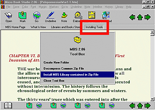After downloading you do not need to worry about unzipping and installing MBS Libraries in your computer as it was needed in MBS 2.03 version. By pressing on "Installing Tools" button in Address Bar Micro Book Studio will open its MBS Tool Box which, by clicking on "Install MBS Library conained in Zip File" item, will almost automatically decompress any .zip file that contains a downloaded MBS Library, create a new folder to store decompressed file, open Micro Book Studio Menu Library Files and install in it a new link item to new library.