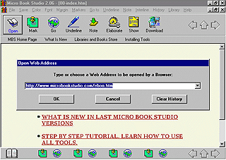Micro Book Studio since its 2.06 version, comes with an address bar, found below Icons Bar. When a web connection is active, by clicking in address bar Micro Book Studio searches and starts Internet Explorer displaying main pages from Micro Book Studio Site, like the Libraries and Books Store for immediate downloading of libraries into your computer.